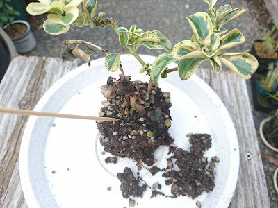 コプロスマ「マーブルクイーン」の苗木をビニールポットから取り出すことができました。